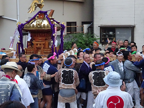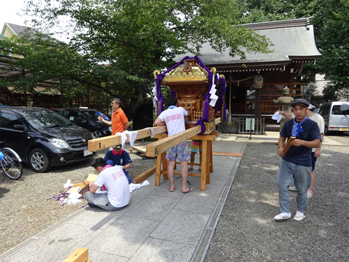 稲妻会の人たちが稲妻会の御神輿を磨いてお祭り準備です。